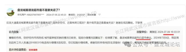 2024年7月9日,武汉市黄陂区市场监督管理局刘店所针对网友留言的问题进行了回复,回复内容如下: 经调查了解,盘龙城麦德龙超市已退市停业。2024年7月9日,我区局刘店所工作人员通过61680315电话将办理情况告知您,您已知晓办理结果。感谢您的来电!祝您生活愉快!经办单位:黄陂区市场监督管理局刘店所。