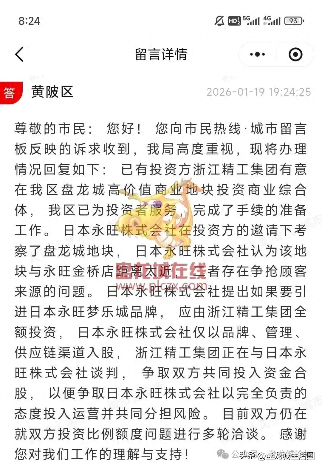 回复如下:我局高度重视,现将办理情况回复如下:已有投资方浙江精工集团有意在我区盘龙城高价值商业地块投资商业综合体,我区已为投资者服务,完成了手续的准备工作。日本永旺株式会社在投资方的邀请下考察了盘龙城地块,日本永旺株式会社认为该地块与永旺金桥店距离太近,二者存在争抢顾客来源的问题。日本永旺株式会社提出如果要引进日本永旺梦乐城品牌,应由浙江精工集团全额投资,日本永旺株式会社仅以品牌、管理、供应链渠道入股,浙江精工集团正在与日本永旺株式会社谈判,争取双方共同投入资金合股,以便争取日本永旺株式会社以完全负责的态度投入运营并共同分担风险。目前双方仍在就双方投资比例额度问题进行多轮洽谈。 相关情况 2022年3月25日,武汉市黄陂区自然资源和规划局发布了关于黄陂区C040202、C040204、C040402管理单元控制性详细规划导则局部修改征求利害关系人意见的公示,内容大概如下所示!