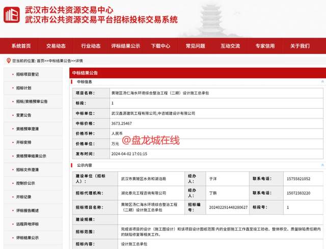 据盘龙城在线从武汉市公共资源交易中心网获悉,位于盘龙城汤仁海的水环境综合整治工程(二期)设计施工总承包工程项目中标结果正在公示,据了解该工程中标价格: 3673.25467万元,招标范围涉及完成该项目的设计(施工图设计)和该项目设计图纸范围内的全部施工工作直至竣工验收、整体移交、质量缺陷责任期内的缺陷修复等相关工作。 盘龙城汤云海 位于盘龙城经济开发区中南部,北依横山,东抱甲宝山,西毗新漖湖,甲宝山、露甲山分列左右,南有飞鸡沟连通府河。襟带周边罗家湾、殷家河等自然村落。面积1.5平方公里,一般水深2米。传说商时汤至此地,见一渔者四面张网,令其张一面去三,并说:“天下四方,地阔天广,惟不惜者,乃入吾网。”天下皆颂汤之仁,就将这片湖泊取名汤仁海。后来又属汤、任两姓产业,藉以汤仁之名以冠之。年产鲜鱼2.5万斤,是天然淡水湖养殖场。