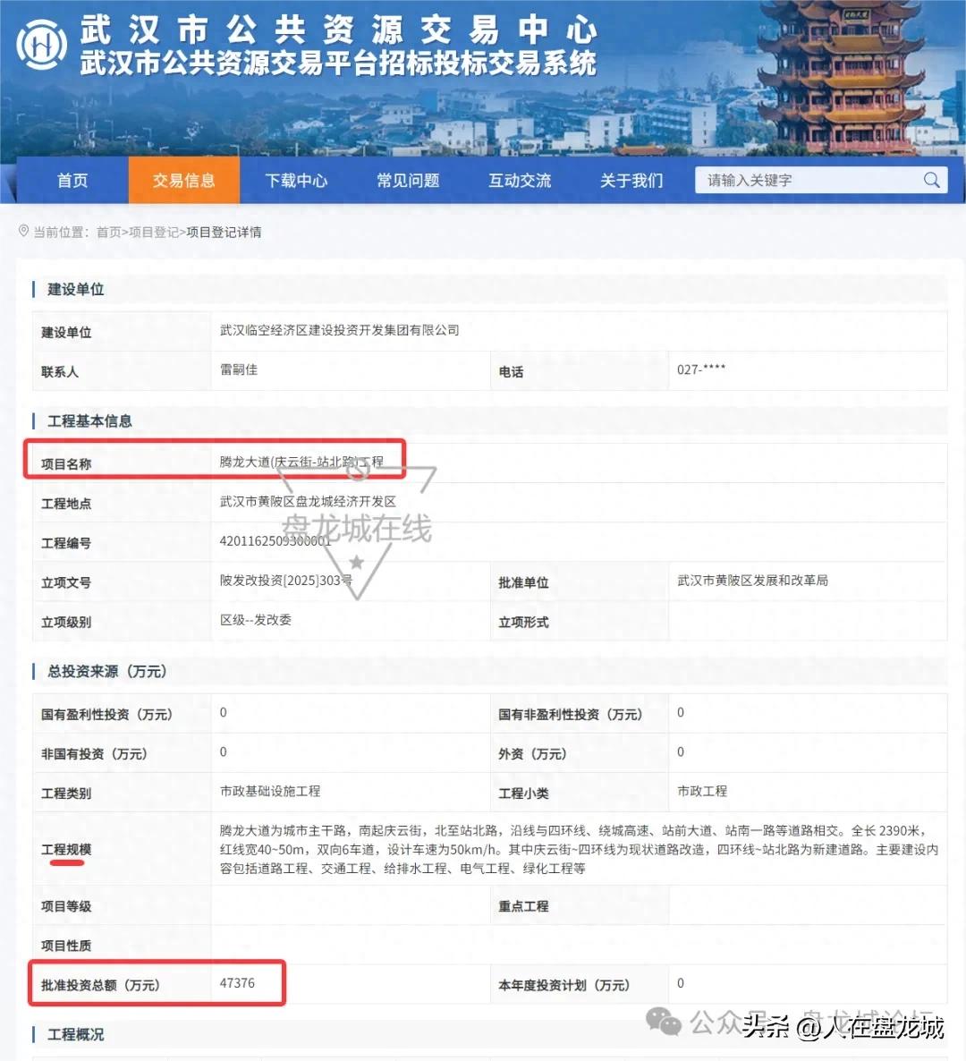 近日,武汉市公共资源交易中心(武汉市公共资源交易平台招标投标交易系统)发布了《腾龙大道(庆云街-站北路)工程》的登记信息,据了解,该项目已由武汉市黄陂区发展改革局批准立项,立项文号为:陂发改投资[2025]303号。项目的建设单位为武汉临空经济区建设投资开发集团有限公司。总投资47376万元。